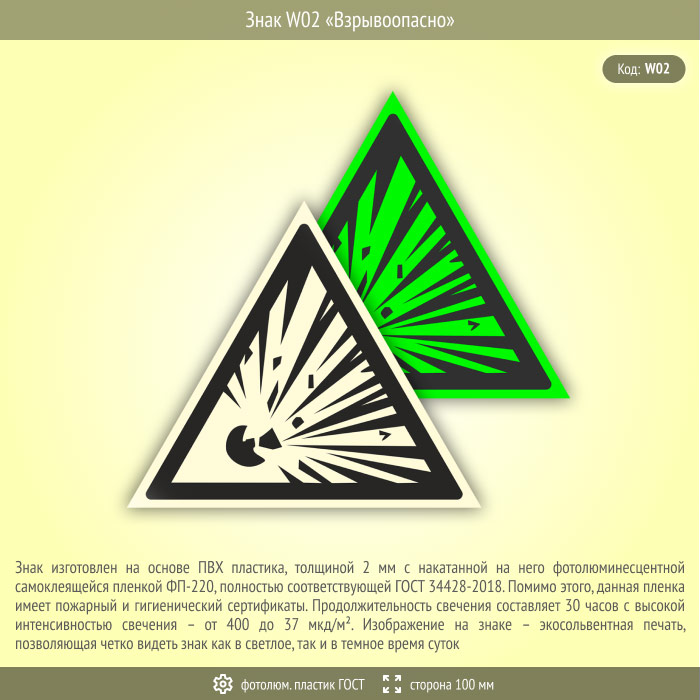 Знак W02 «Взрывоопасно» (фотолюминесцентный пластик ГОСТ 34428-2018, сторона 100 мм) в Волгограде купить