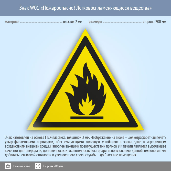 Знак W01 «Пожароопасно! легковоспламеняющиеся вещества» (пластик, сторона 200 мм) в Волгограде купить