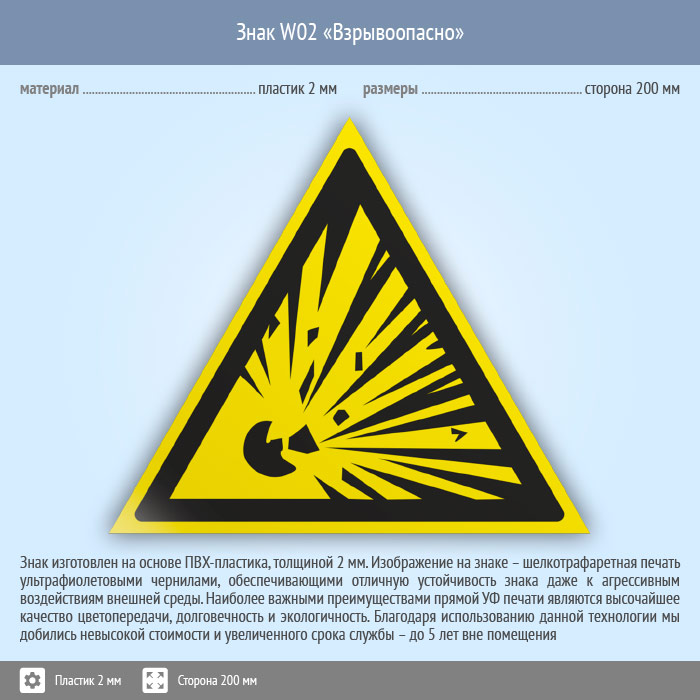 Знак W02 «Взрывоопасно» (пластик, сторона 200 мм) в Волгограде купить