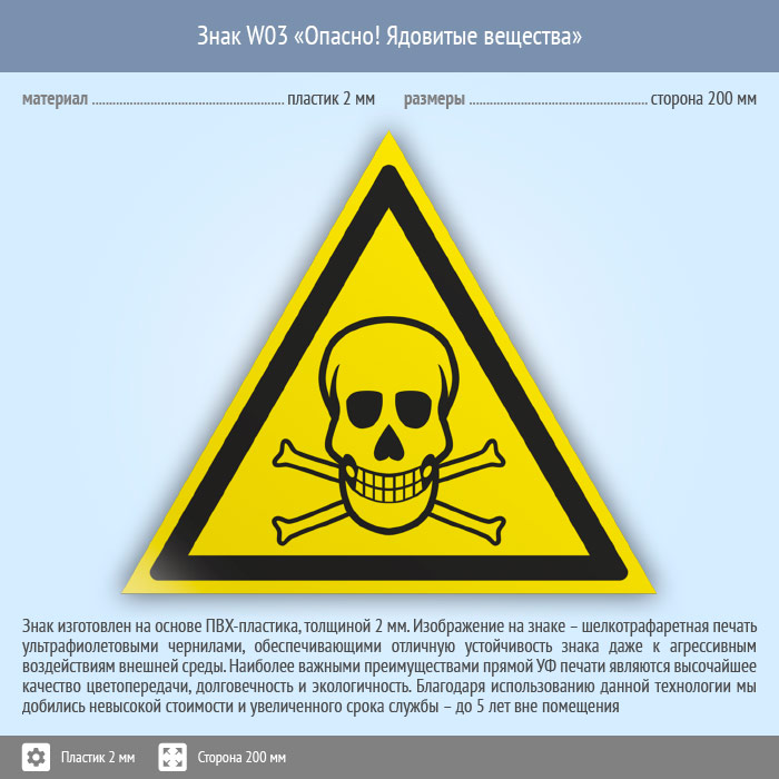 Знак W03 «Опасно! ядовитые вещества» (пластик, сторона 200 мм) в Волгограде купить
