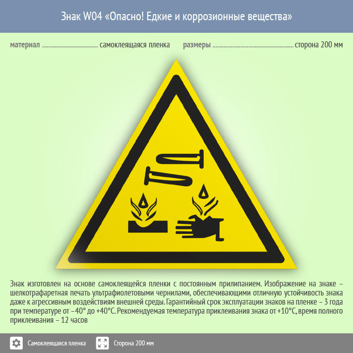 Знак W04 «Опасно! едкие и коррозионные вещества» (пленка, сторона 200 мм) в Волгограде купить