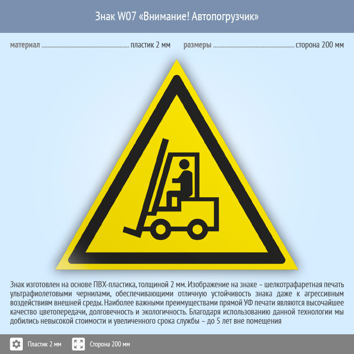 Знак W07 «Внимание! автопогрузчик» (пластик, сторона 200 мм) в Волгограде купить