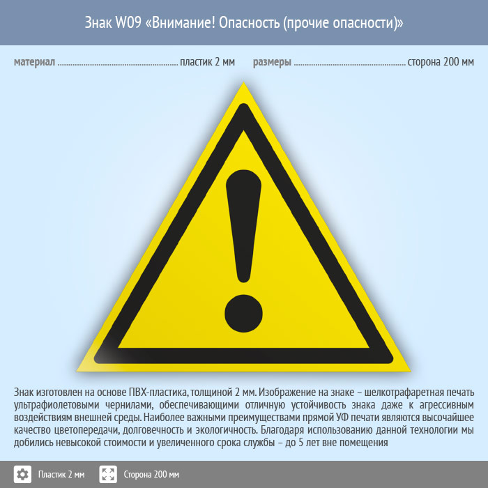 Знак W09 «Внимание! опасность (прочие опасности)» (пластик, сторона 200 мм) в Волгограде купить