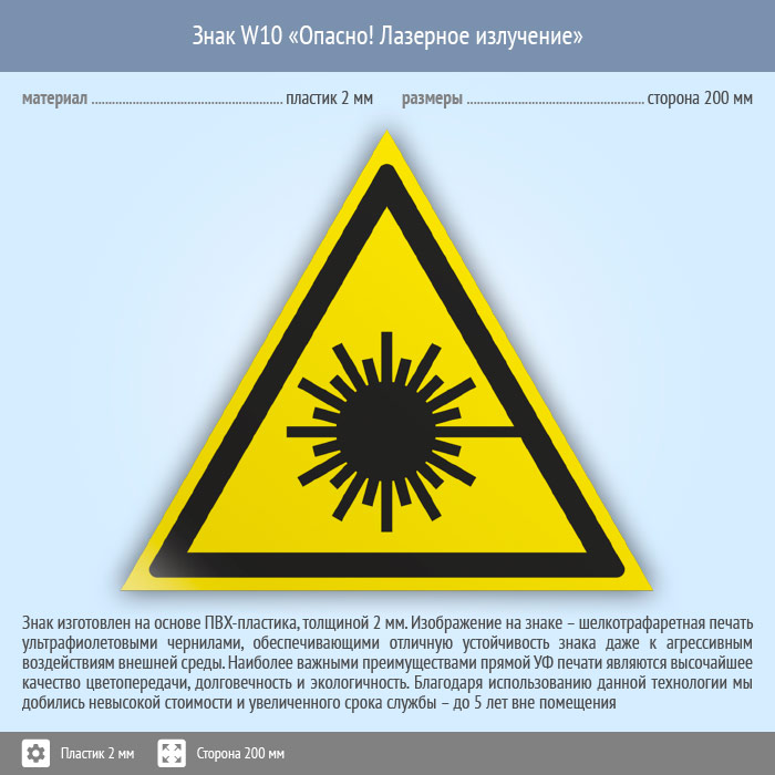Знак W10 «Опасно! лазерное излучение» (пластик, сторона 200 мм) в Волгограде купить