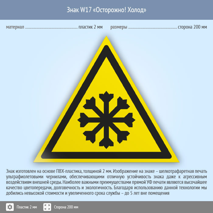 Знак W17 «Осторожно! холод» (пластик, сторона 200 мм) в Волгограде купить