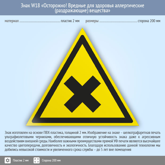 Знак W18 «Осторожно! вредные для здоровья аллергические (раздражающие) вещества» (пластик, сторона 200 мм) в Волгограде купить