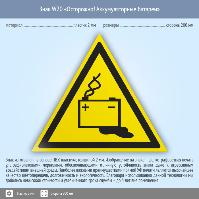 Знак W20 «Осторожно! аккумуляторные батареи» (пластик, сторона 200 мм) в Волгограде купить