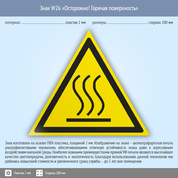 Знак W26 «Осторожно! горячая поверхность» (пластик, сторона 200 мм) в Волгограде купить
