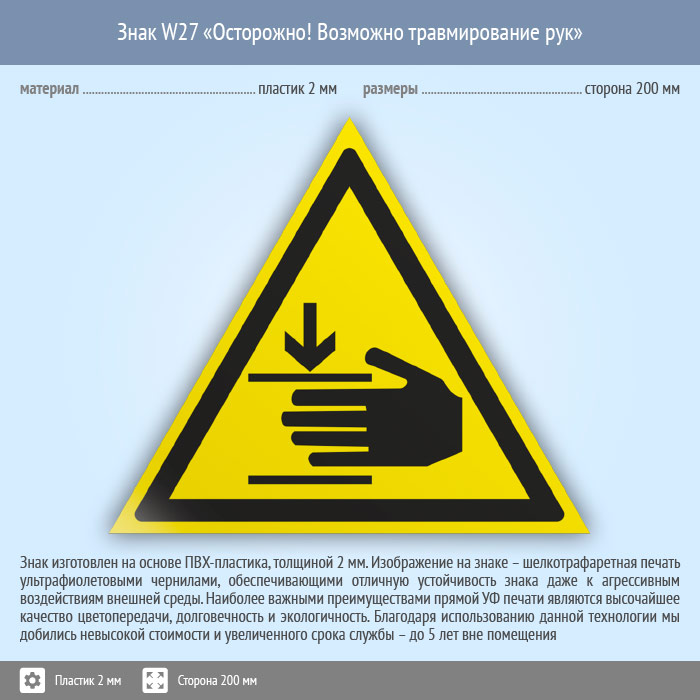 Знак W27 «Осторожно! возможно травмирование рук» (пластик, сторона 200 мм) в Волгограде купить