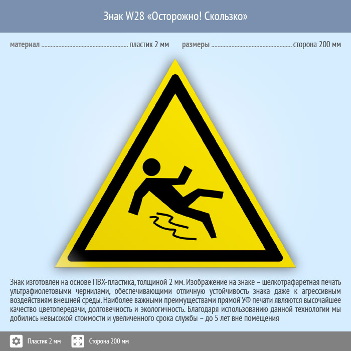 Знак W28 «Осторожно! скользко» (пластик, сторона 200 мм) в Волгограде купить