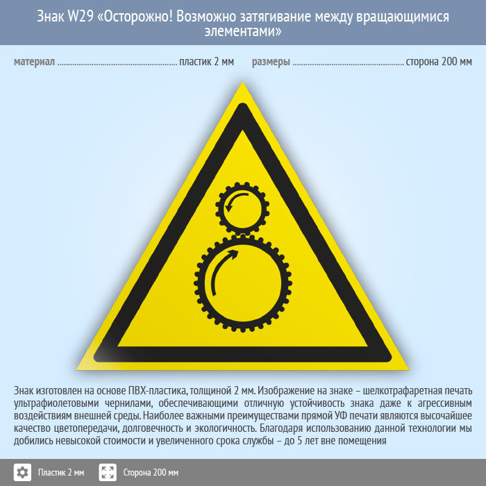 Знак W29 «Осторожно! возможно затягивание между вращающимися элементами» (пластик, сторона 200 мм) в Волгограде купить