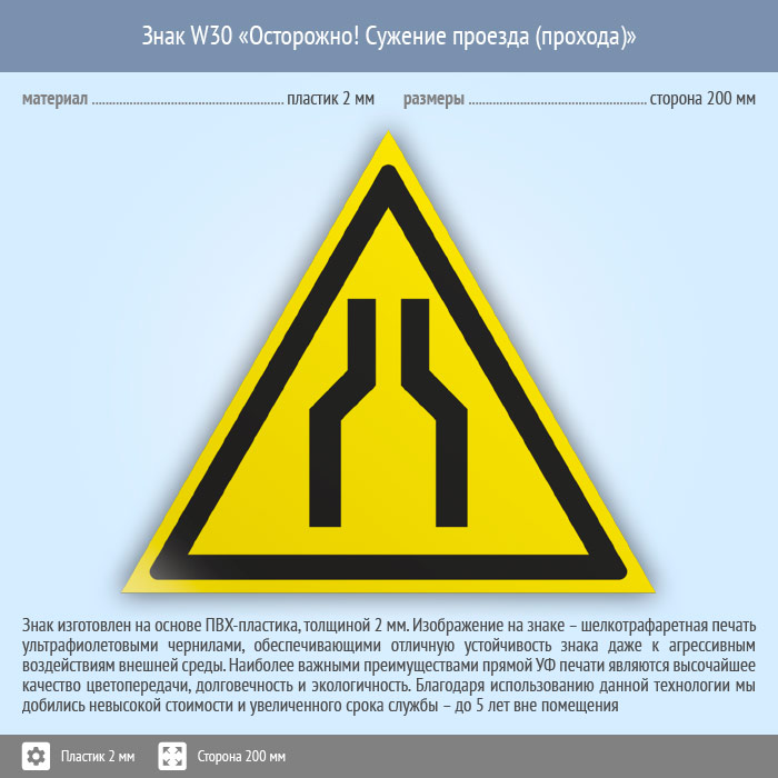 Знак W30 «Осторожно! сужение проезда (прохода)» (пластик, сторона 200 мм) в Волгограде купить