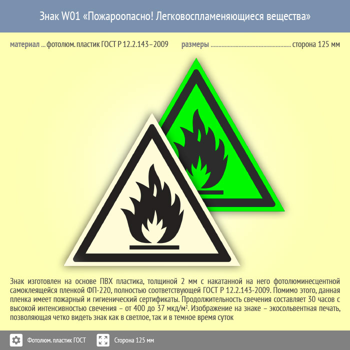Знак W01 «Пожароопасно! Легковоспламеняющиеся вещества» (фотолюминесцентный пластик ГОСТ 34428-2018, сторона 125 мм) в Волгограде купить
