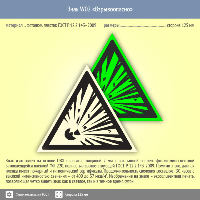 Знак W02 «Взрывоопасно» (фотолюминесцентный пластик ГОСТ 34428-2018, сторона 125 мм) в Волгограде купить