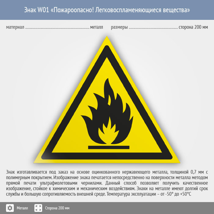 Знак W01 «Пожароопасно! легковоспламеняющиеся вещества» (металл, сторона 200 мм) в Волгограде купить