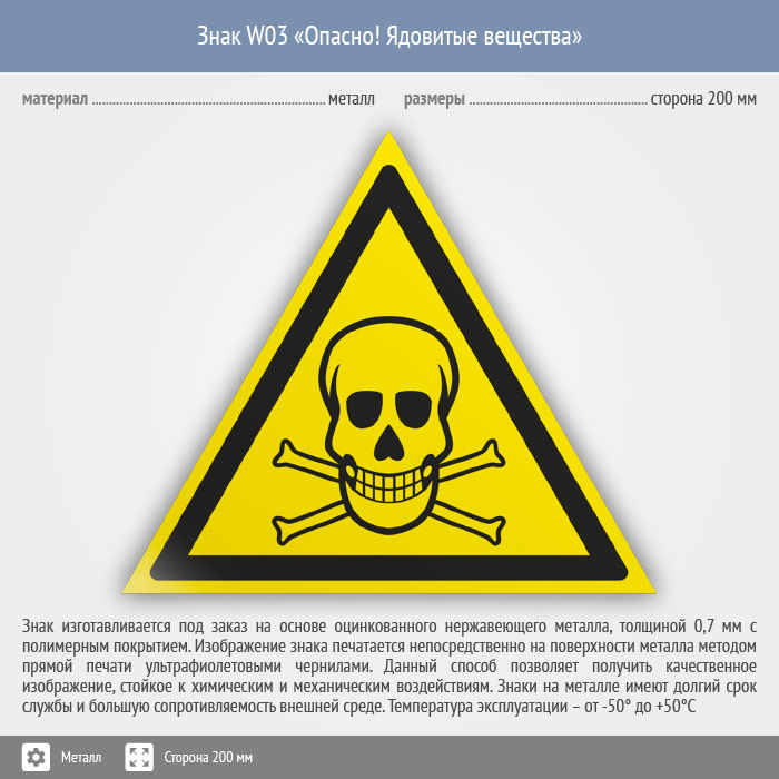 Знак W03 «Опасно! ядовитые вещества» (металл, сторона 200 мм) в Волгограде купить