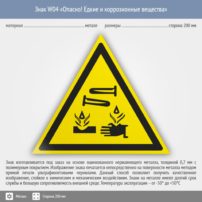 Знак W04 «Опасно! едкие и коррозионные вещества» (металл, сторона 200 мм) в Волгограде купить