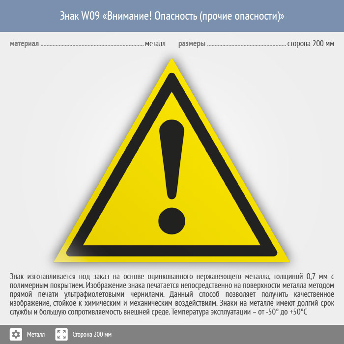 Знак W09 «Внимание! опасность (прочие опасности)» (металл, сторона 200 мм) в Волгограде купить