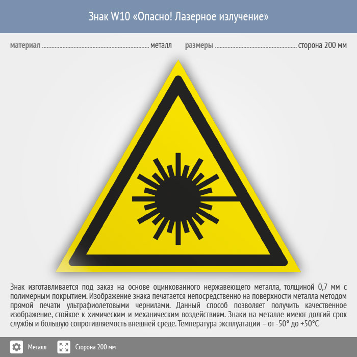 Знак W10 «Опасно! лазерное излучение» (металл, сторона 200 мм) в Волгограде купить