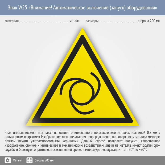 Знак W25 «Внимание! автоматическое включение (запуск) оборудования» (металл, сторона 200 мм) в Волгограде купить