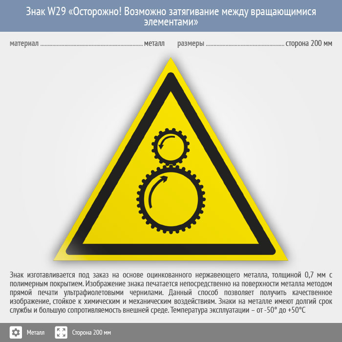 Знак W29 «Осторожно! возможно затягивание между вращающимися элементами» (металл, сторона 200 мм) в Волгограде купить
