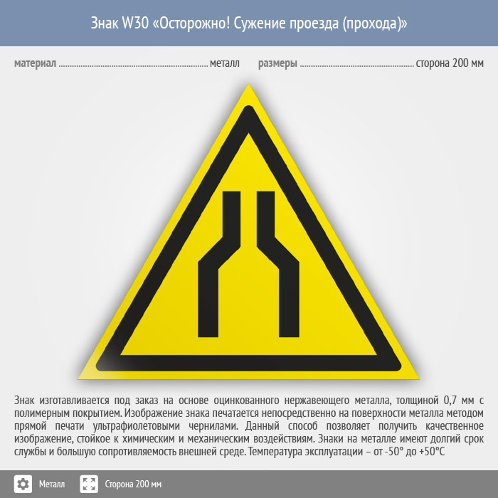Знак W30 «Осторожно! сужение проезда (прохода)» (металл, сторона 200 мм) в Волгограде купить