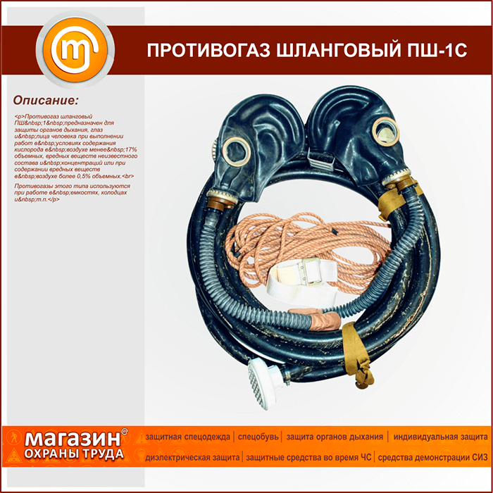 Противогазы шланговые предназначены для защиты органов дыхания, глаз и лица человека при выполнении работ в условиях содержания кислорода в воздухе менее 17% объемных, вредных веществ неизвестного состава и концентраций или при содержании вредных веществ в воздухе более 0,5%