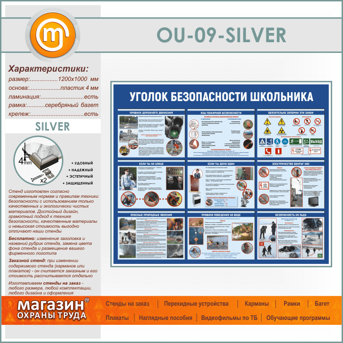 Стенд «Уголок безопасности школьника» (OU-09-SILVER) в Волгограде купить