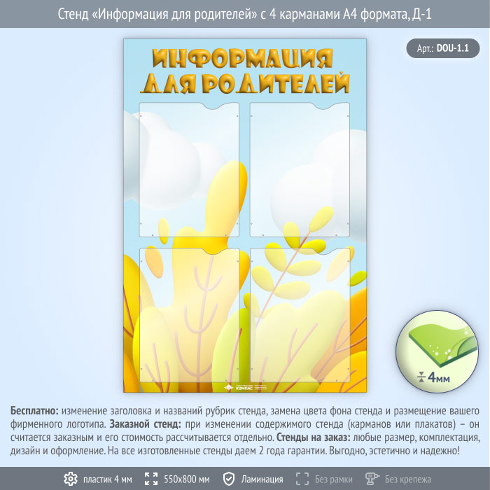 Стенд «Информация для родителей» с 4 карманами А4 формата (DOU-1.1) в Волгограде купить