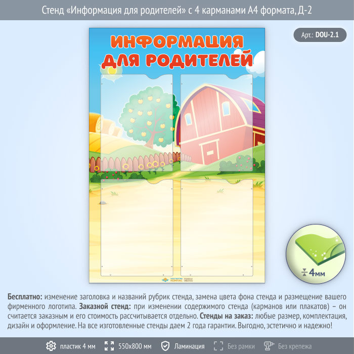 Стенд «Информация для родителей» с 4 карманами А4 формата (DOU-2.1) в Волгограде купить