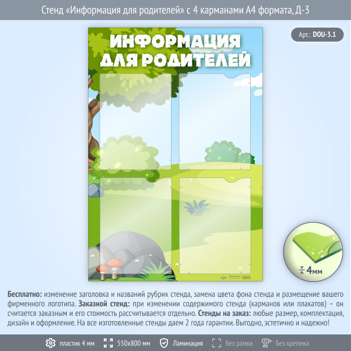 Стенд «Информация для родителей» с 4 карманами А4 формата (DOU-3.1) в Волгограде купить
