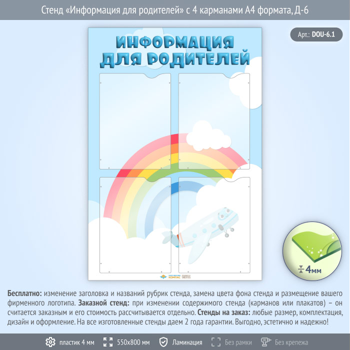 Стенд «Информация для родителей» с 4 карманами А4 формата (DOU-6.1) в Волгограде купить