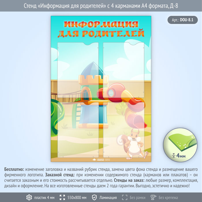 Стенд «Информация для родителей» с 4 карманами А4 формата (DOU-8.1) в Волгограде купить