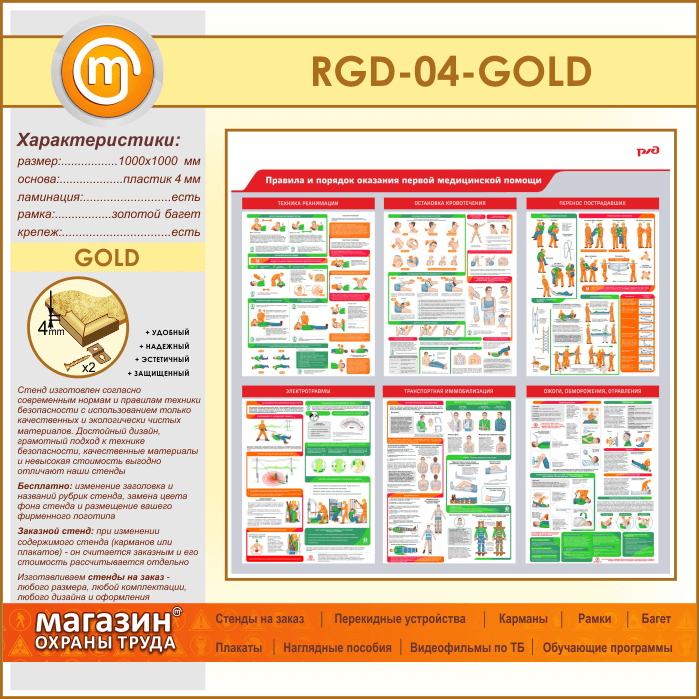 Стенд «Правила и порядок оказания первой медицинской помощи» (RGD-04-GOLD) в Волгограде купить