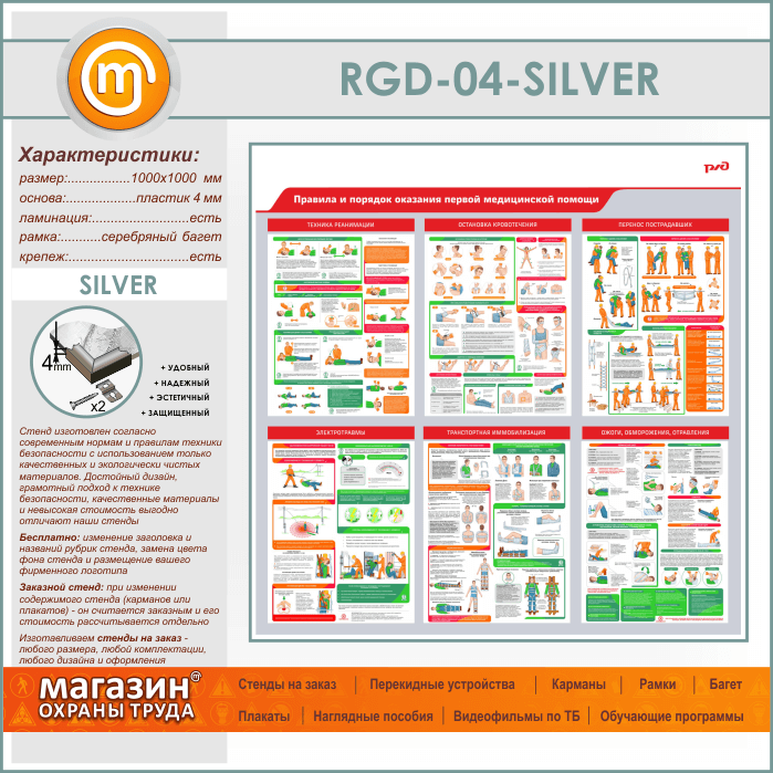 Стенд «Правила и порядок оказания первой медицинской помощи» (RGD-04-SILVER) в Волгограде купить