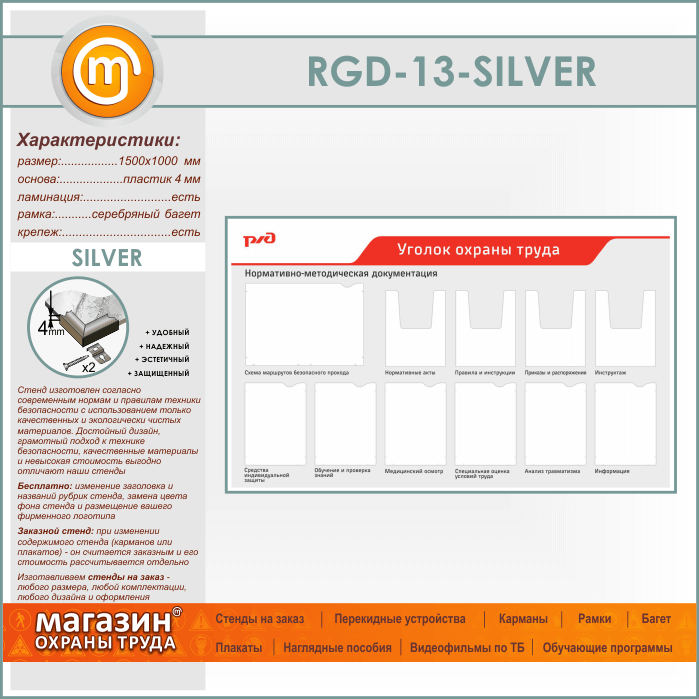 Стенд «Уголок охраны труда» с 1 плоским карманом А3 формата, 6 плоскими и 4 объемными карманами А4 формата (RGD-13-SILVER) в Волгограде купить