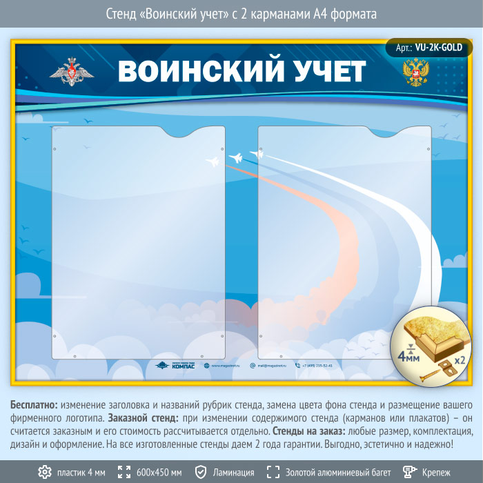 Стенд «Воинский учет» с 2 карманами А4 формата (VU-2K-GOLD) в Волгограде купить