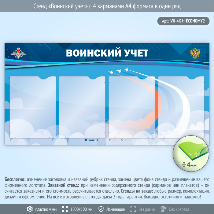 Стенд «Воинский учет» с 4 карманами А4 формата в один ряд (VU-4K-H-ECONOMY2) в Волгограде купить