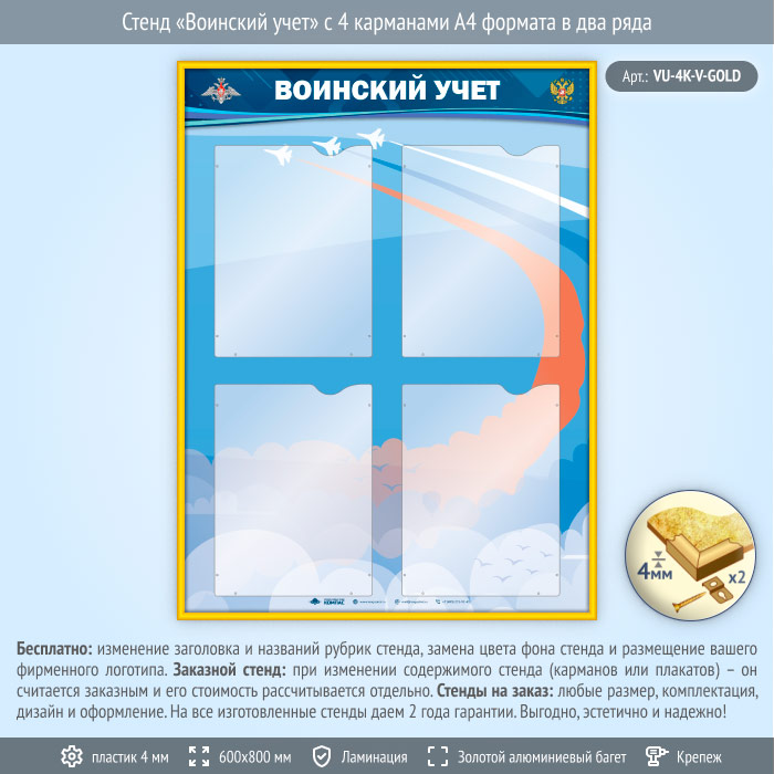Стенд «Воинский учет» с 4 карманами А4 формата в два ряда (VU-4K-V-GOLD) в Волгограде купить