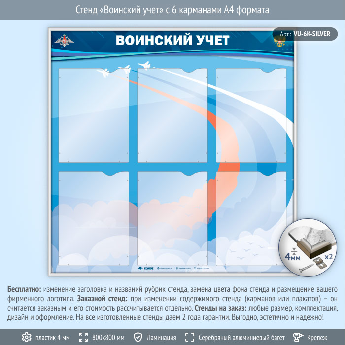 Стенд «Воинский учет» с 6 карманами А4 формата (VU-6K-SILVER) в Волгограде купить