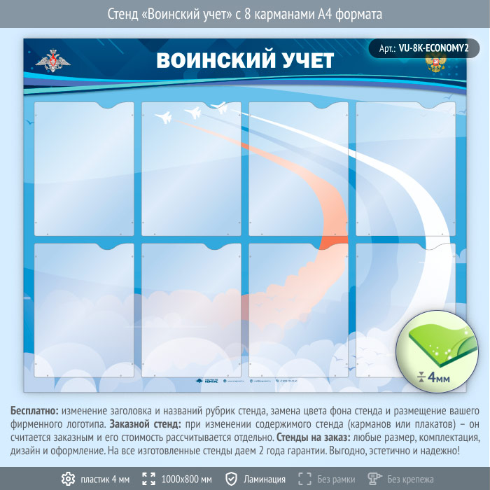 Стенд «Воинский учет» с 8 карманами А4 формата (VU-8K-ECONOMY2) в Волгограде купить