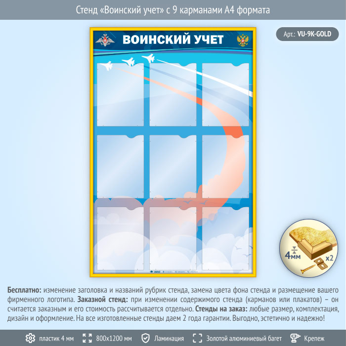 Стенд «Воинский учет» с 9 карманами А4 формата (VU-9K-GOLD) в Волгограде купить