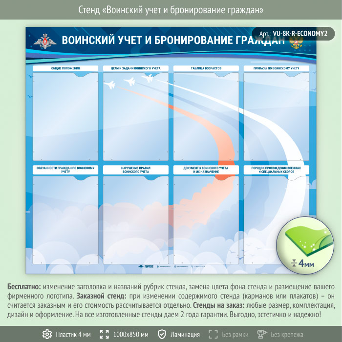 Стенд «Воинский учет и бронирование граждан» с 8 карманами А4 формата (VU-8K-R-ECONOMY2) в Волгограде купить