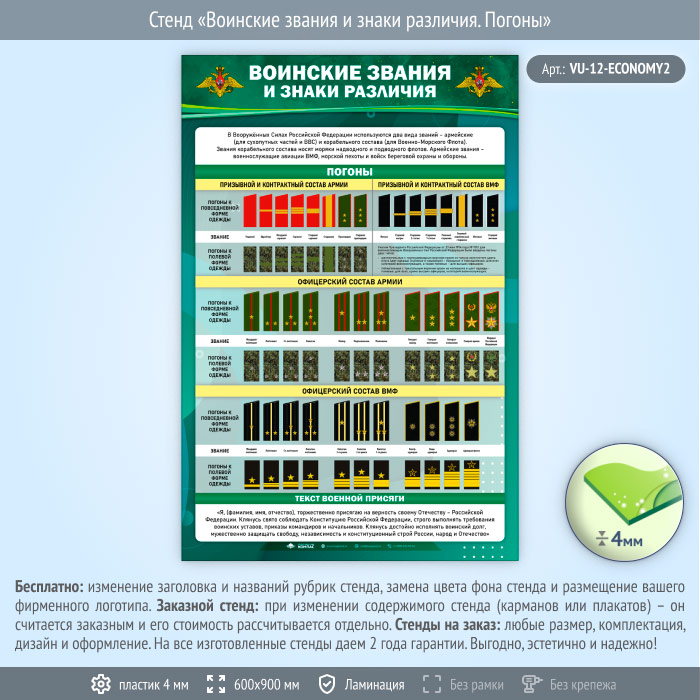 Стенд «Воинские звания и знаки различия. Погоны» (VU-12-ECONOMY2) в Волгограде купить