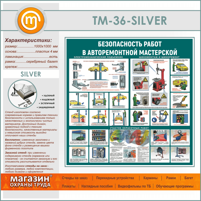 Стенд «Безопасность работ в авторемонтной мастерской» (TM-36-SILVER) в Волгограде купить