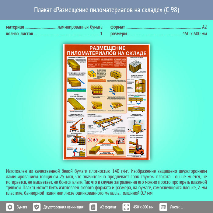 Плакат «Размещение пиломатериалов на складе» (С-98, ламинированная бумага, А2, 1 лист) в Волгограде купить