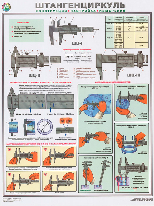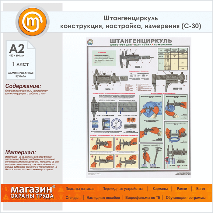 Плакат «Штангенциркуль - конструкция, настройка, измерения» (С-30, ламинированная бумага, А2, 1 лист) в Волгограде купить