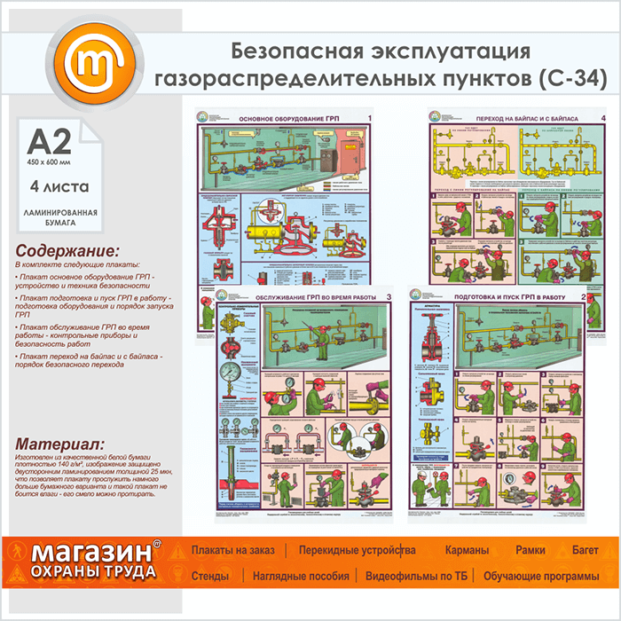 Плакаты «Безопасная эксплуатация газораспределительных пунктов» (С-34, ламинированная бумага, А2, 4 листа) в Волгограде купить