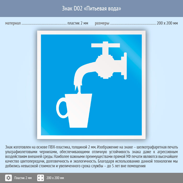 Знак D02 «Питьевая вода» (пластик, 200х200 мм) в Волгограде купить