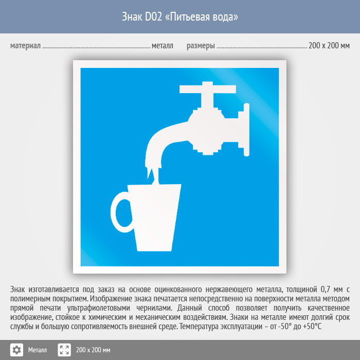 Знак D02 «Питьевая вода» (металл, 200х200 мм) в Волгограде купить